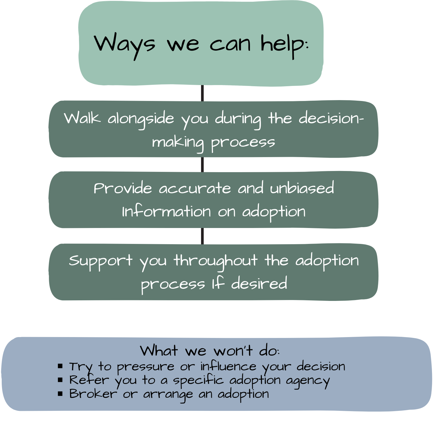 If you are considering adoption, we can help by walking alongside you during the decision-making process. We can provide accurate and unbiased information on adoption if you are looking for a trustworthy source of information. We can also support you through the adoption process if that is what you choose. We will not pressure or attempt to influence your decision, refer you to a specific adoption agency, or broker or arrange an adoption on your behalf. We are only interested in your emotional, spiritual, and physical health and supporting the decision your make, whatever that decision is.